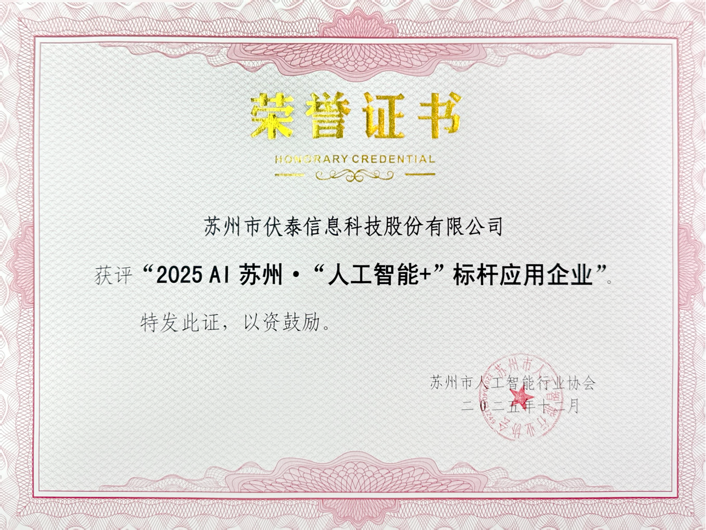伏泰科技获评2025AI苏州·“人工智能+”标杆应用企业2025-12-23 17:46